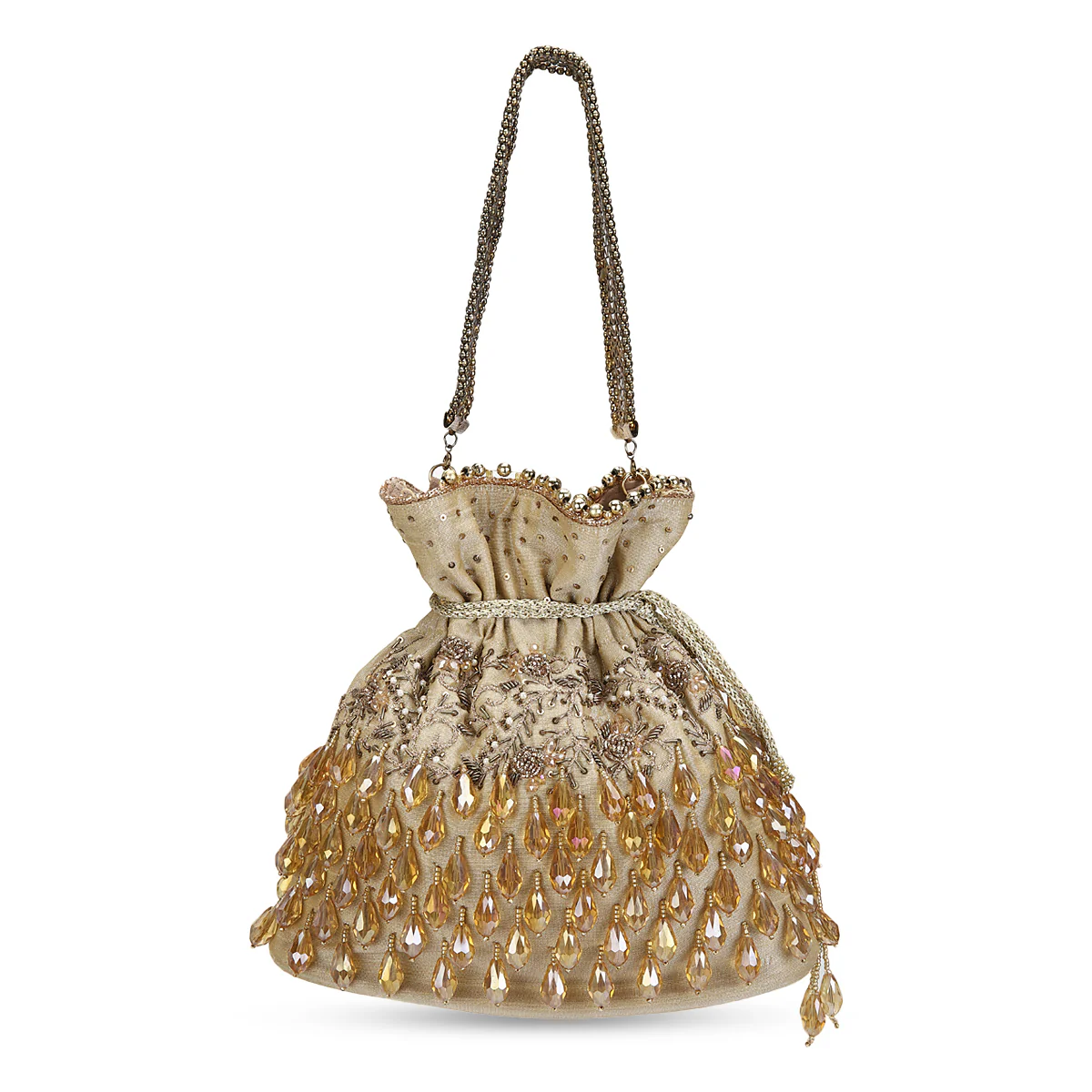 Introducing a potli that is very dear to hearts, “Dilara” from our AW19 Musalsal collection. Intricately designed potli on a with a U shape pattern with multiple embellishments and glass bead latkans all over giving the potli the glam it needs. Its adorned with mukaish sequins, dabka nakshee and many more on a gold base.